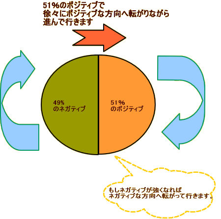 51%のポジティブを意識することによって、とっても安定したポジティブの状態をキープ出来るようになります。 100%のポジティブに比べてとてもバランスが取れ尚且つ浮き沈みが最小限に抑える事が出来ます。